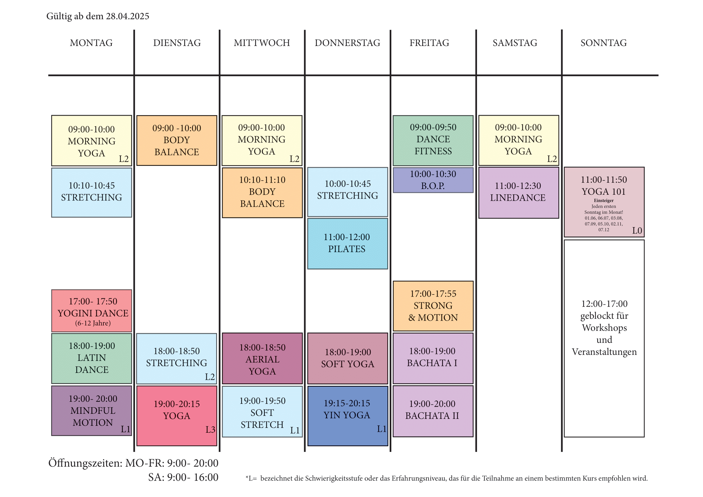 - L1 steht für sanfte, ruhige Kurse mit Fokus auf Mobilität, Atmung und Regeneration.